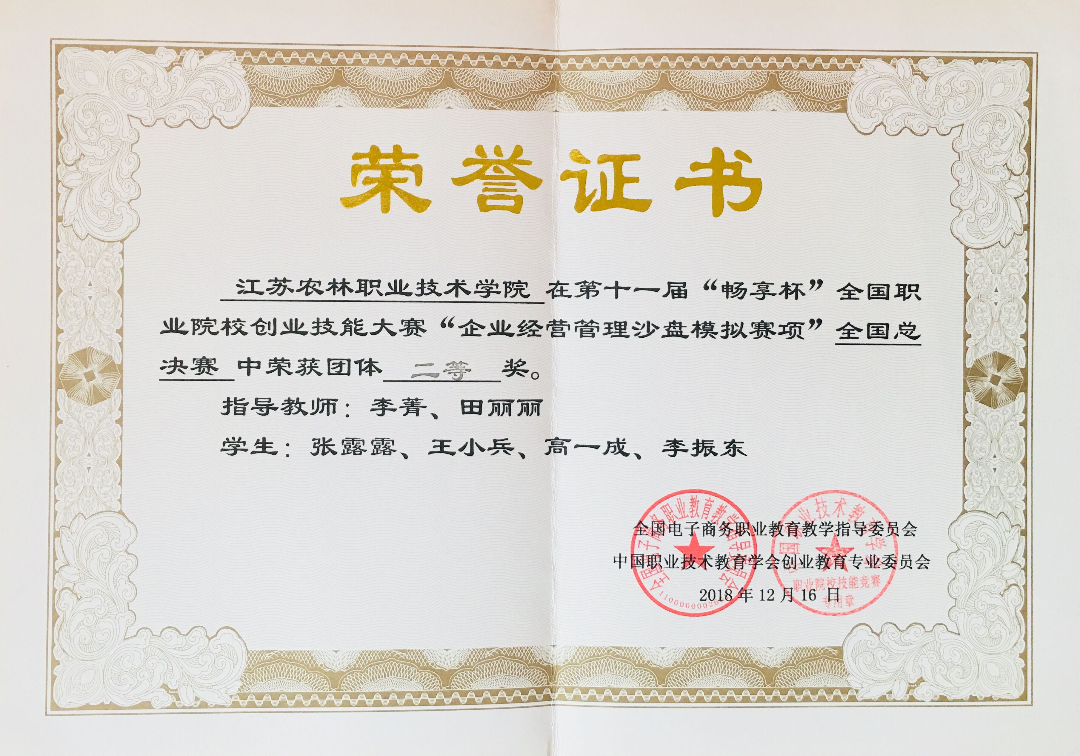 12月15—17日,由全国电子商务职业教育教学指导委员会和中国职业技术教育学会创业教育专业委员会联合主办的第十一届“畅享杯”全国职业院校创业技能大赛企业经营管理沙盘模拟赛项全国总决赛在四川成都职业技术学院举办。永利官网由教师李菁、田丽丽指导,学生高一成、李振东、王小兵、张露露组成的代表队夺得该项赛事团体二等奖。