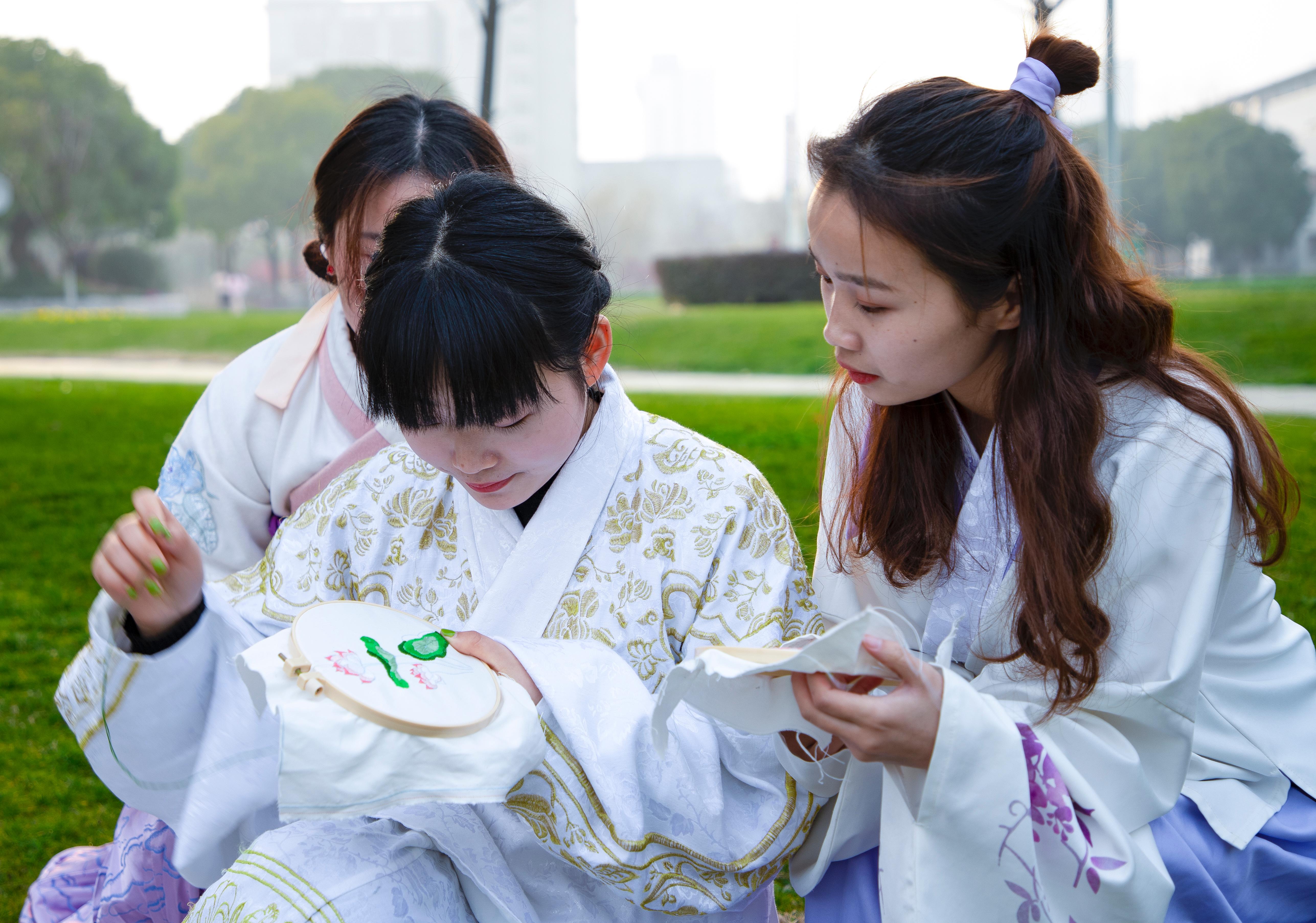 活动中,学生们体验刺绣、剪纸、制簪等传统女红文化项目。女生们身着端庄的汉服,纤指翻飞,针线穿梭,白绢灵动,针法虽生疏,但也呈现出别样的美。一把剪刀,一张纸,一方剪纸送满园春色。青丝渐绾玉搔头,簪就三千繁华,金步摇,簪头花,飘雅出尘。