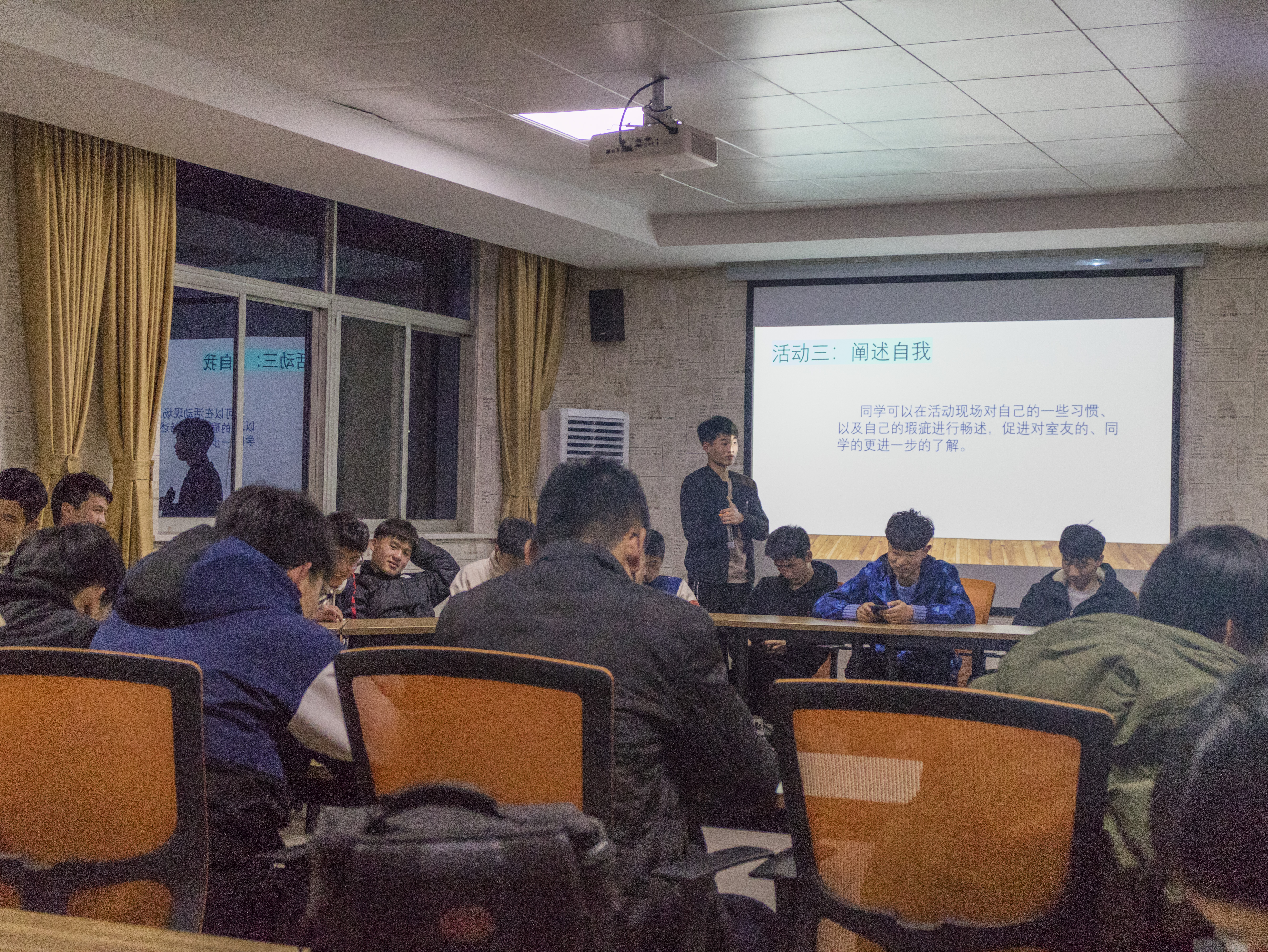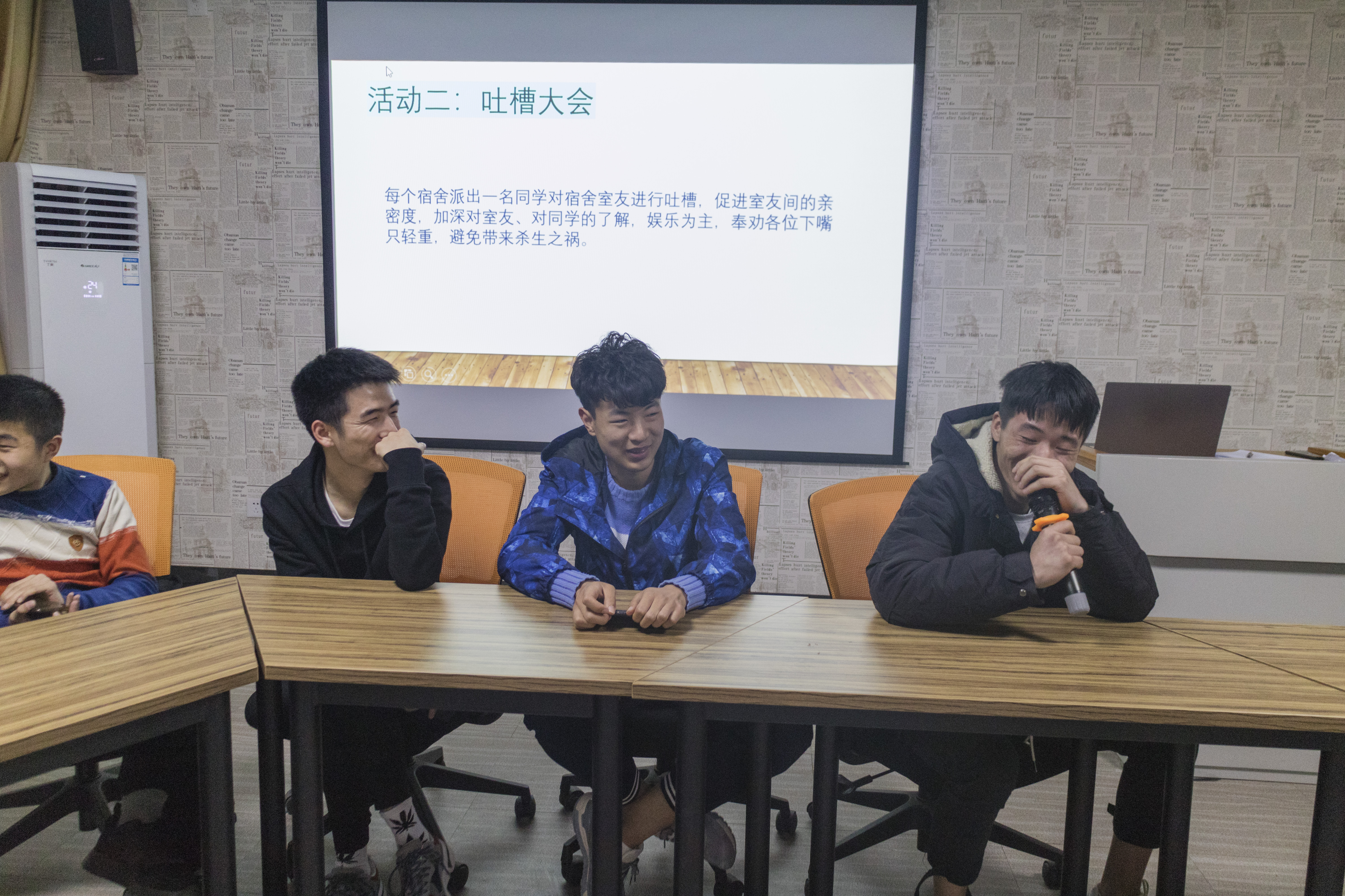 活动围绕宿舍人际关系处理的主题,从三个环节有序展开。在“谁是大忽悠”环节,主持人通过趣味小游戏调动活动现场的气氛,使整个现场活跃起来;在“吐槽大会”环节,每个宿舍派出一名同学对宿舍室友进行吐槽,促进室友间的亲密度,加深对室友、对同学的了解;在“自我反省”环节,参与同学在现场对自己的一些习惯、以及自己的瑕疵进行畅述,促进对室友的、同学的更进一步的了解。最后就如何改善宿舍人际关系,共同营造良好的生活氛围进行协商,并达成一致意见。通过活动,让宿舍成员之间加深了理解,拉近了宿舍成员心灵的距离。