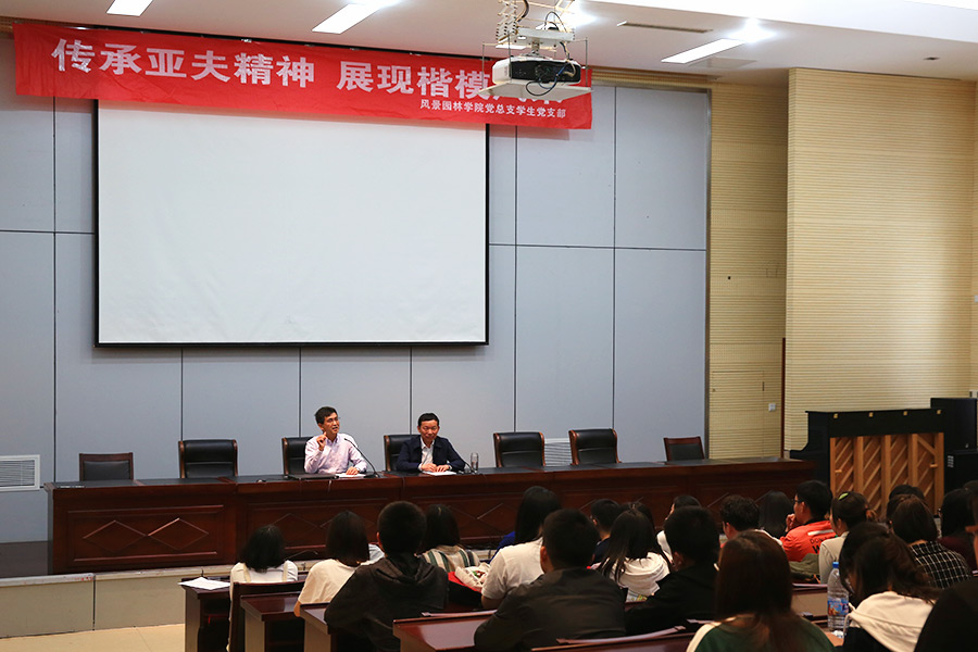 4月22日下午,风景园林学院党总支学生党支部开展“村支部书记谈基层党建引领乡村振兴”活动。作为 “传承亚夫精神 展现楷模风采”系列活动之一,本次活动邀请白兔镇解塘村党支部书记张冬才作为主讲人,为在场100多名师生呈现了一场关于基层党建引领乡村振兴的精彩讲座。