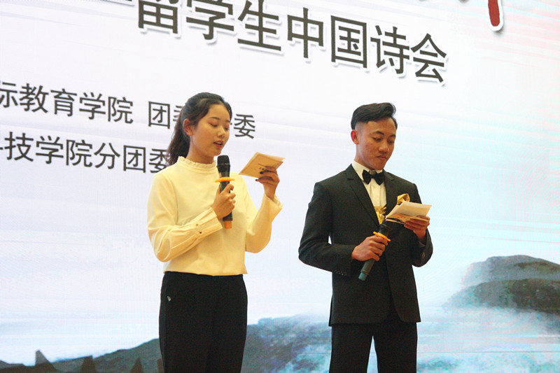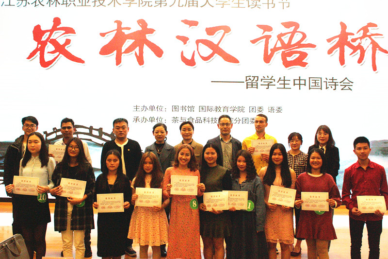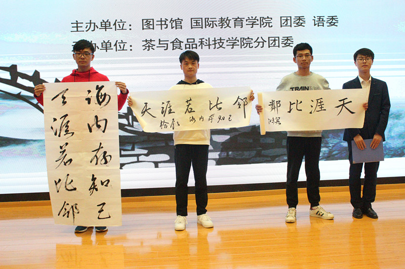 为弘扬中华诗词魅力,培养留学生学习汉语的兴趣,提高留学生汉语运用能力,4月26日,第九届大学生读书节系列活动之“诵古今经典 享诗词之美”汉语桥留学生诗词会在图书馆报告厅成功举办。此次活动由图书馆、国际教育学院、校团委、语委主办,茶与食品科技学院团委承办,来自国际教育学院的12名留学生参加了本次诵读大赛。
