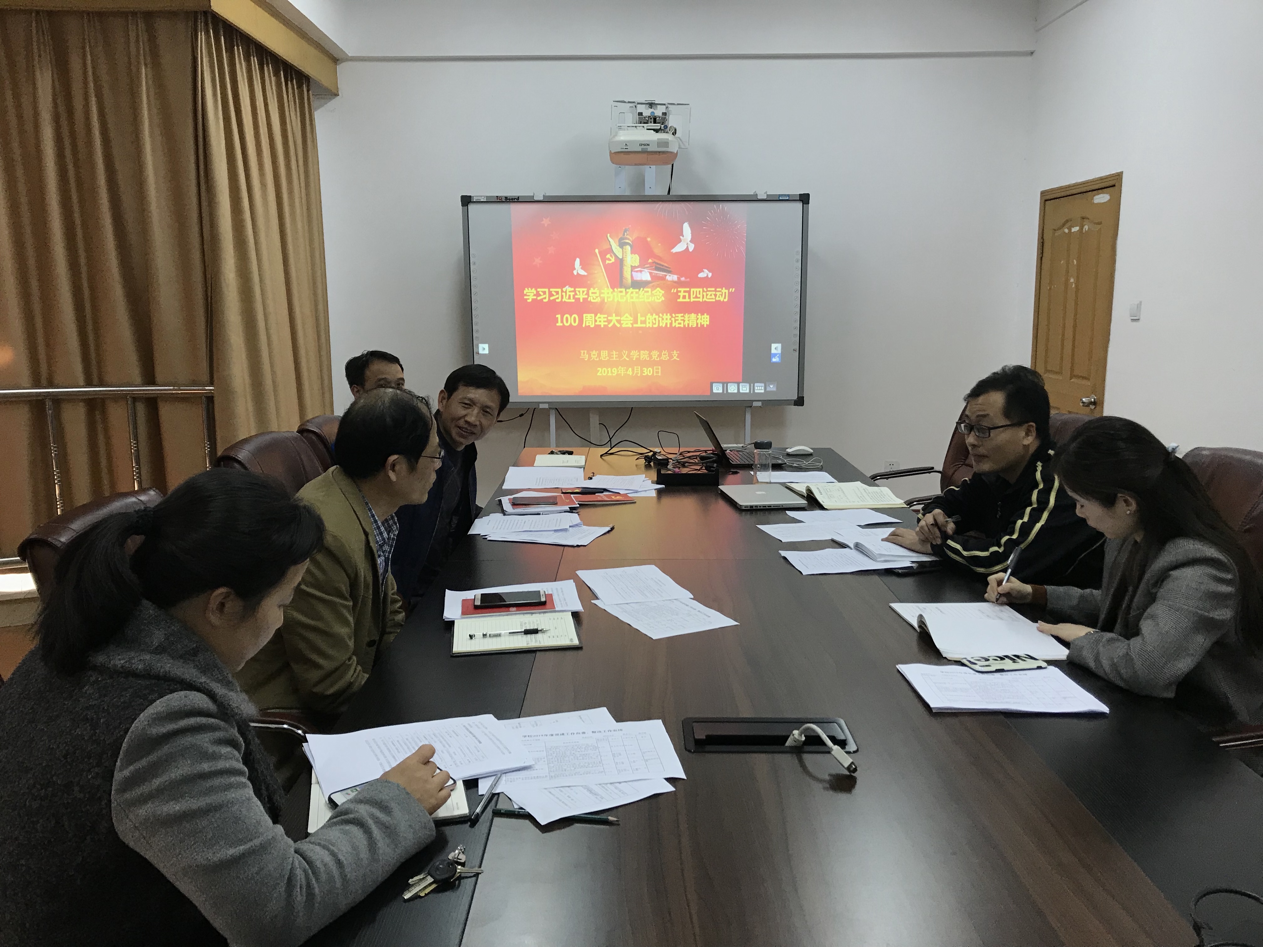4月30日下午,马克思主义学院党总支委员会在综合楼504会议室开展了学习习近平总书记在纪念五四运动100周年大会上的讲话》研讨会,全体总支委员、支部书记和党务秘书参加了会议。