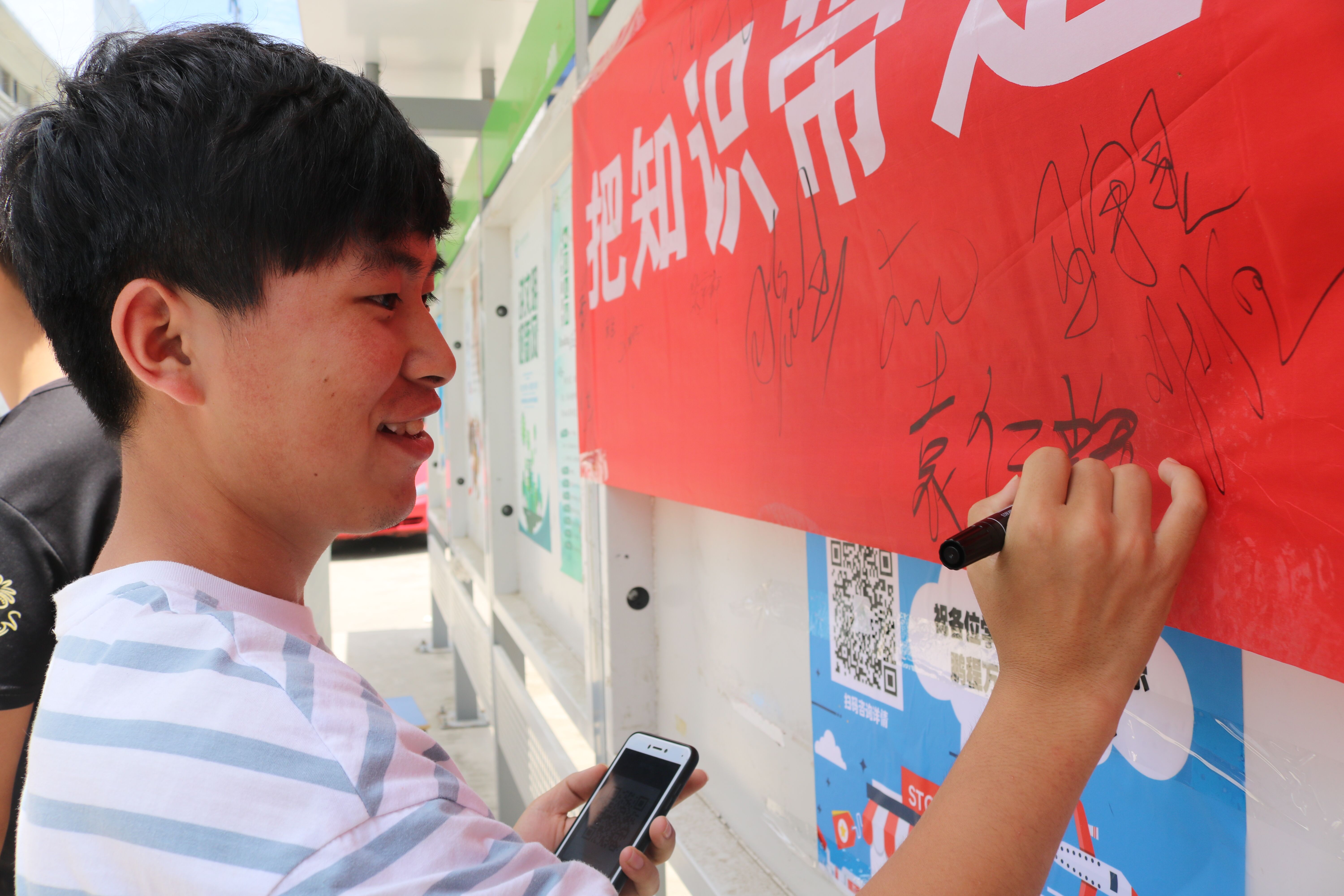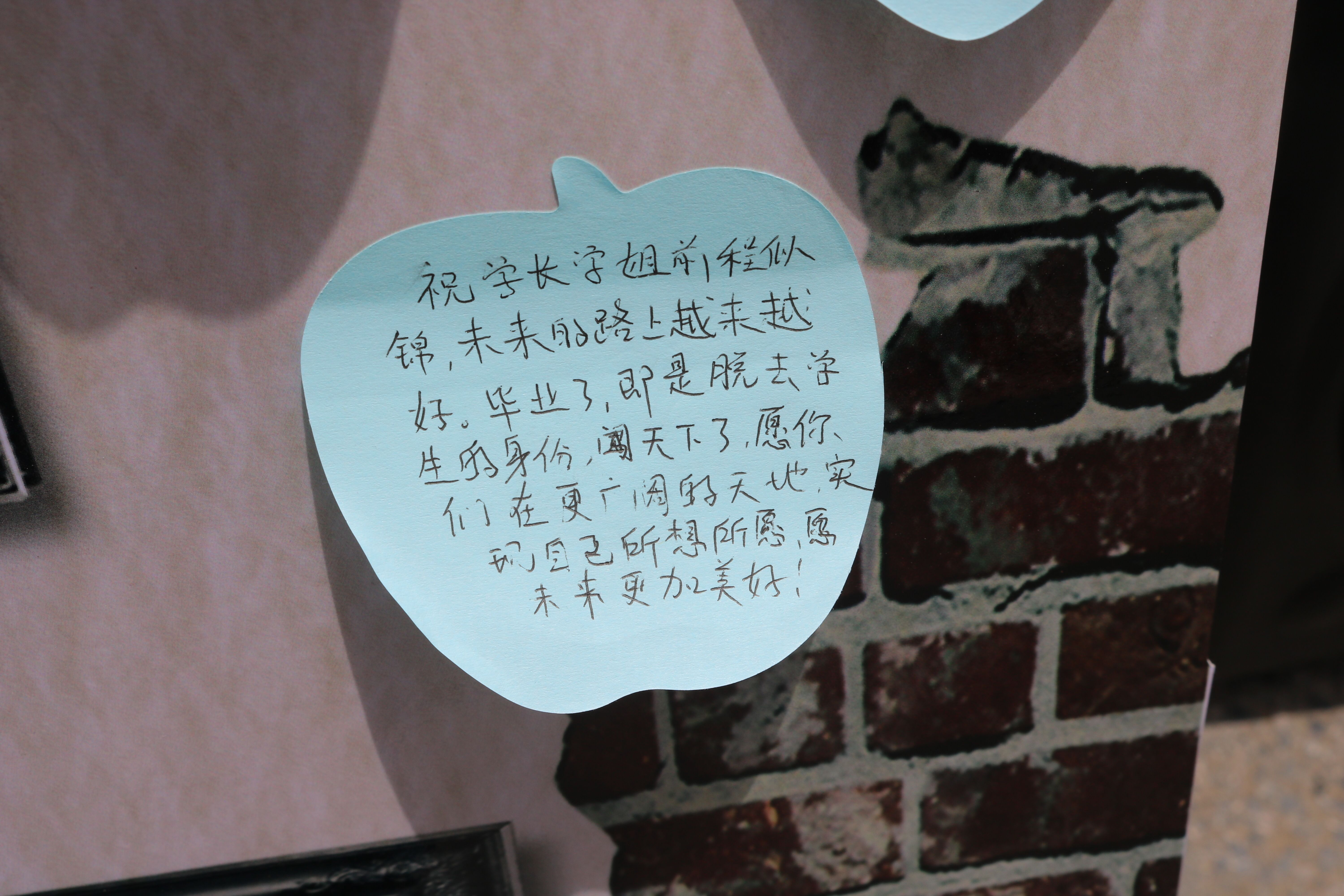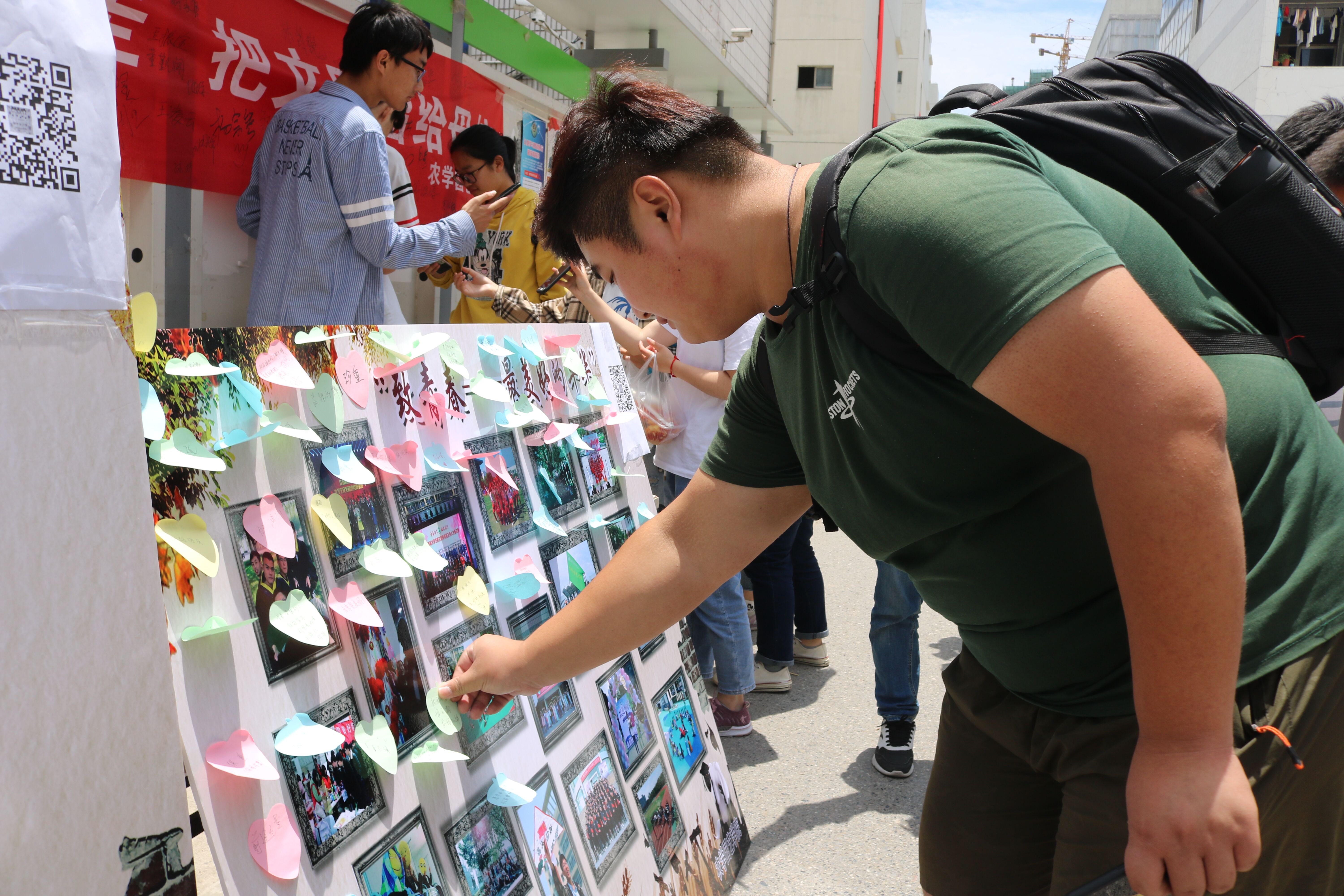 活动中,同学们通过照片展示、撰写祝福便签、横幅签名等,唤起毕业生们对大学三年生活的追忆和对未来的期盼。过往的毕业生们纷纷驻足,写下对大学同学、老师、朋友的不舍;在校生同学也参与其中,写下对学长学姐的祝福。你我共同相约文明离校,将那一份美好珍藏心底。