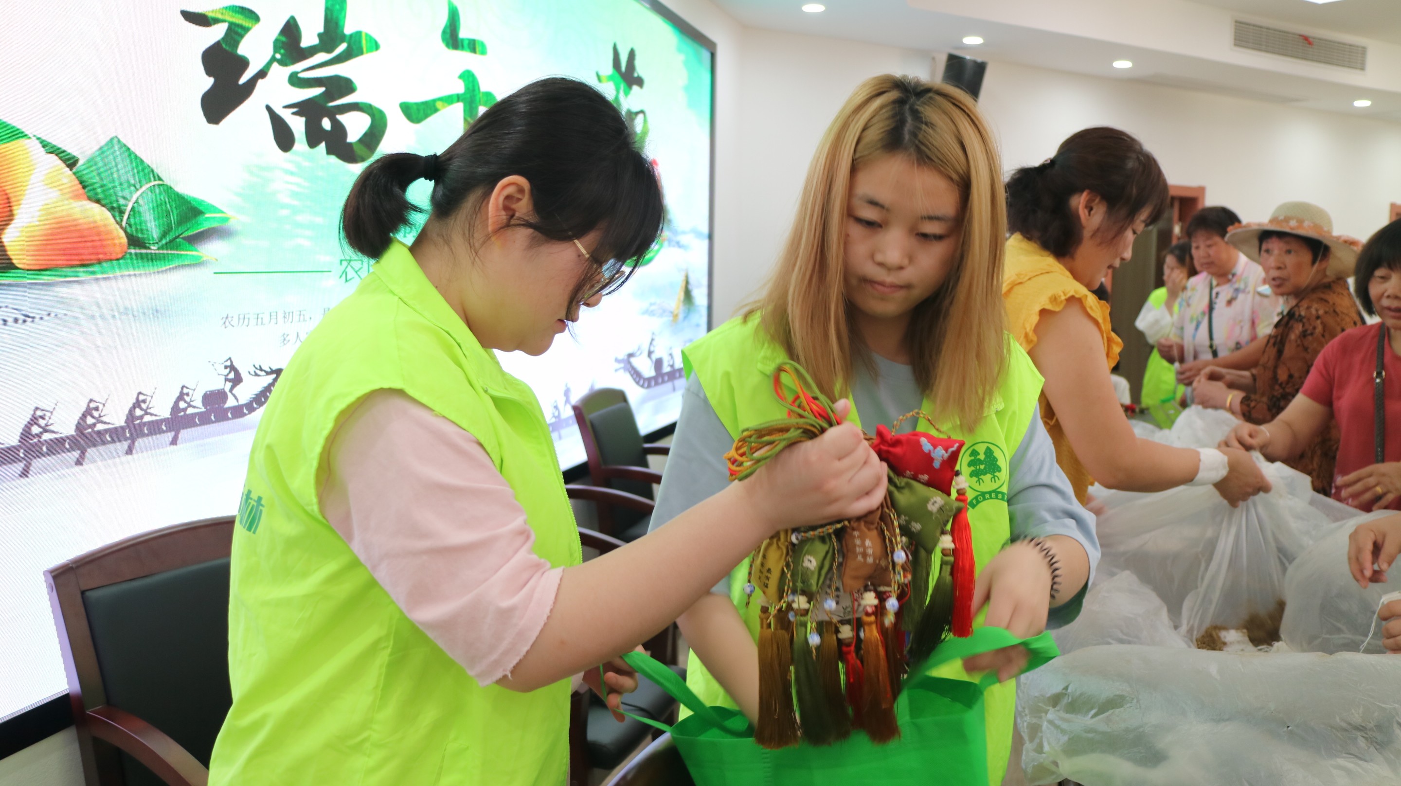 志愿者们事先准备好了糯米、粽叶,在社区阿姨们的指导下,一起熟练地将粽叶折成锥形、放糯米,最后折叠粽叶、用棉线捆扎,一个个棱角分明的粽子就成了。志愿者们随后还制作了香囊,将祝福和关爱都装进漂亮的香囊之中,活动现场散发着阵阵清香。最后,志愿者们将亲手做的粽子和香囊送给社区的空巢老人们,给他们带去一份节日的问候。