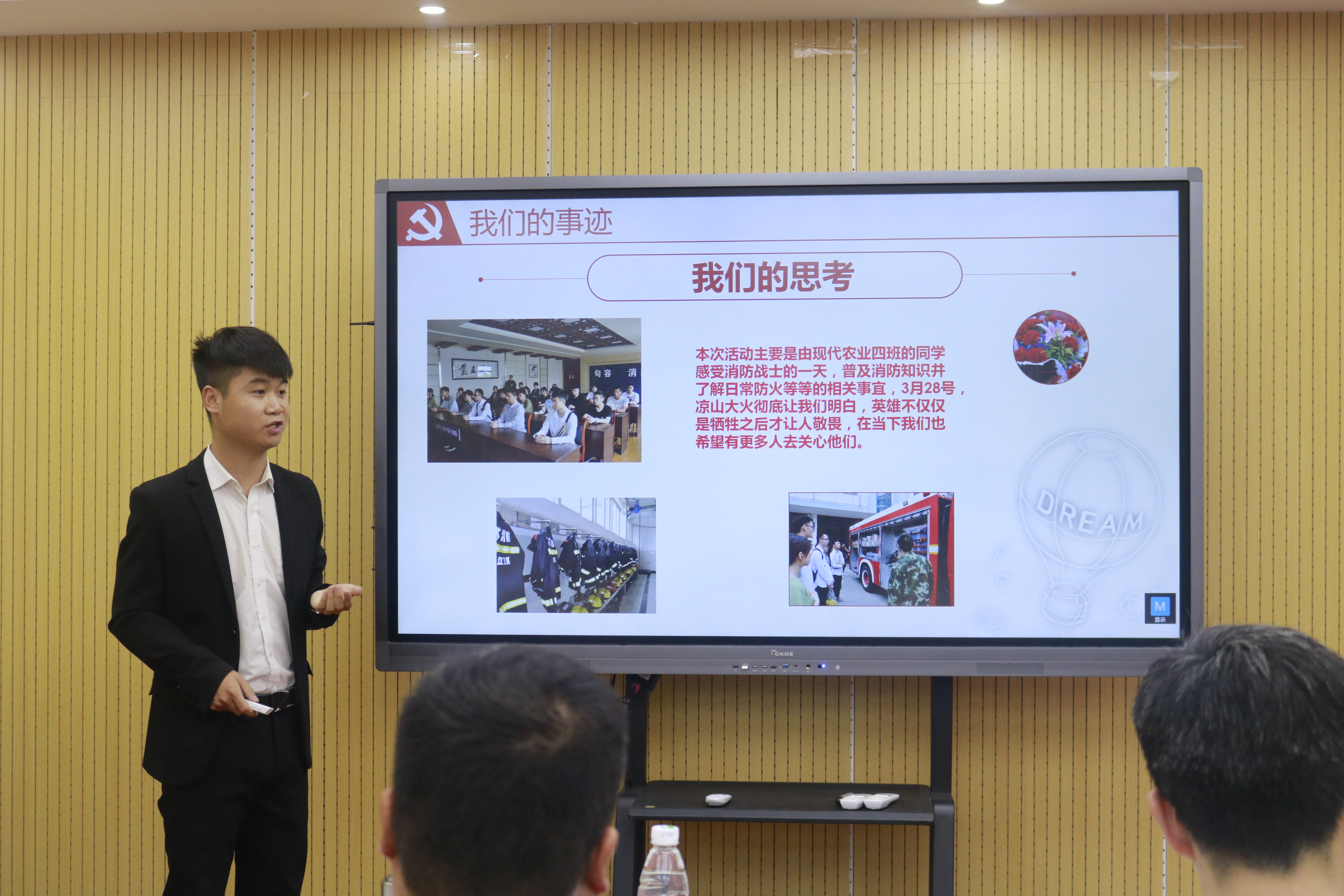 本次活动共有18支参赛支部,每个支部都通过PPT演讲的形式,从活动主题、活动组织、成效收获等方面向我们展示了的团日活动的开展情况。各支部的活动有参观大屠杀纪念馆、参观新四军纪念馆、走访博爱学校、走近消防大队、与团徽团旗创意合影、唱团歌、重温入团誓词、五四运动知识问答等等,形式新颖,内容丰富。评委们根据各申报单位活动开展及现场答辩情况进行打分,最终18现代农业技术(4)班和17现代农业技术(定制村干)3班荣获本次活动的一等奖。