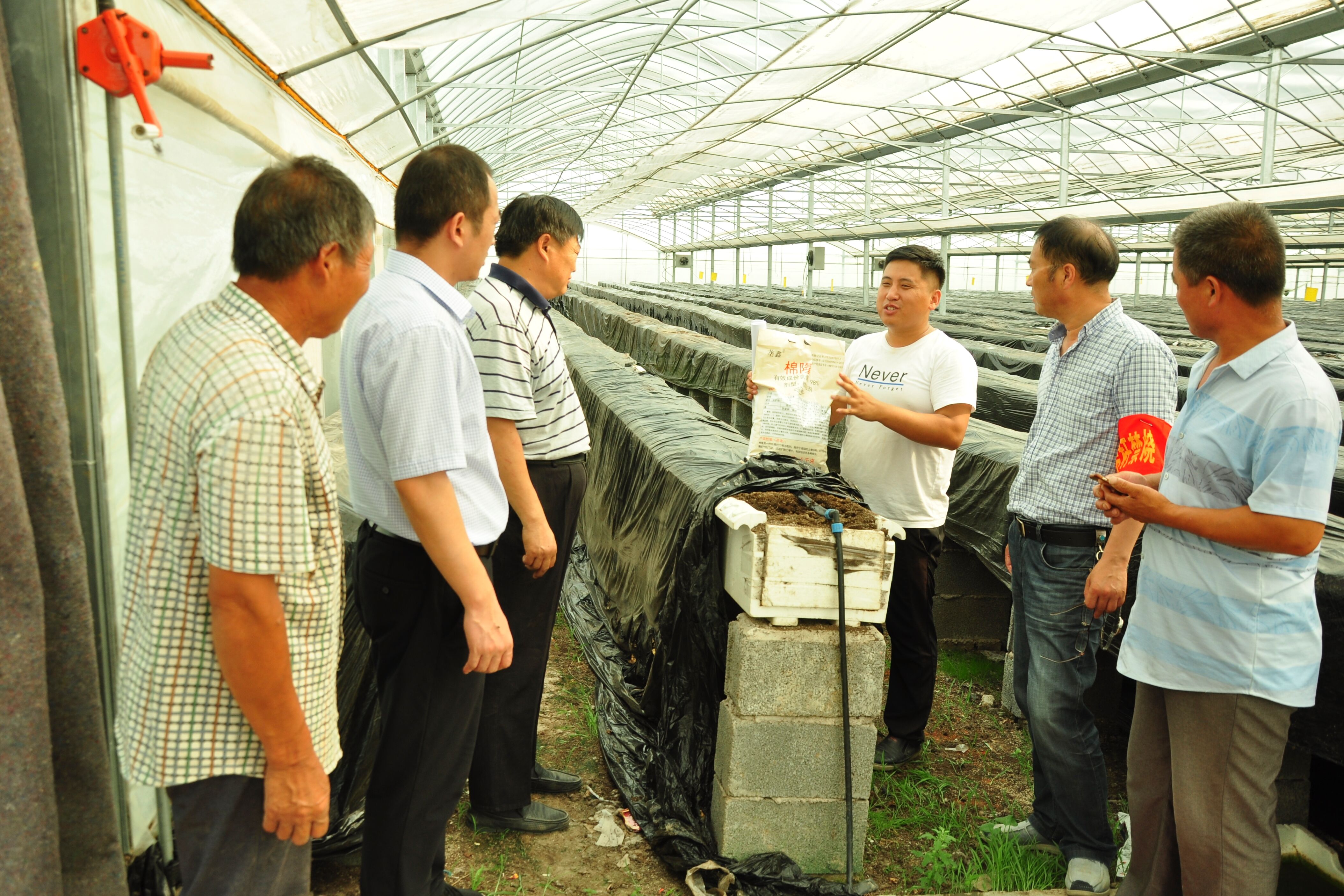 专家团队一行参观考察了潼阳镇后屯村的西瓜种植情况,了解当地西瓜栽培和销售情况,并现场进行了西瓜嫁接育苗、改良整枝和配方施肥等技术培训;专家团队调研了茆圩乡茆圩村、杨兴村以及沭阳采莓儿生态农业科技有限公司的草莓生产状况,针对草莓连作障碍问题,专家团队提出了棉隆消毒技术,并现场培训了草莓基质棉隆消毒方法;专家团队还查看了草莓种苗繁育情况,介绍了草莓夏季繁苗的注意事项,重点讲解了草莓育苗期间病虫害的防治技术。另外,还向当地草莓种植户推广了永利官网自行研发的草莓超高垄栽培技术,并现场进行了培训。