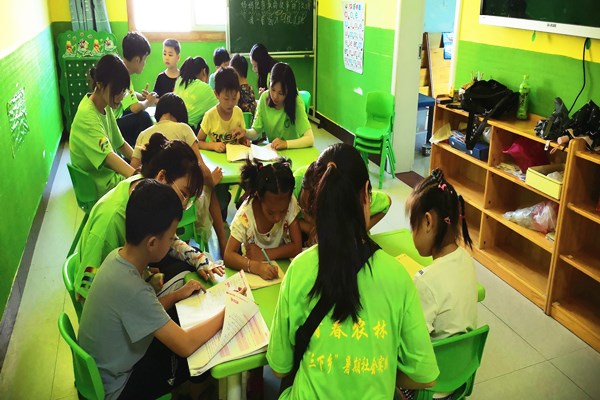 8月3日一大早,“心言心语”暑期实践团的青衣少年们踩着树影的缝隙,来到了响亮珠心算幼儿园——位于江西省宜黄县的私立幼儿园,与可爱的孩子们展开了愉快的学习和相处时光,在孩子们琅琅的读书声中正式开始了我们的普通话支教工作。实践团的小老师们以活泼生动、特色新颖、风趣幽默的教学风格,充分调动了孩子们的参与意识和积极性。整个教学过程中,孩子们纯真的笑声、热烈的掌声都是对我们实践团的小老师们的教学方式和教学水平的肯定。“这些孩子大部分都是留守儿童,受到当地语言风俗的影响,孩子们的普通话都存在一定的问题,并且老年人普遍的知识水平的差距,不能在学习上帮助孩子。农林学子的到来,不仅向孩子和老人推广了普通话,更加帮助了孩子的学习。”珠心算幼儿园的李园长感慨地说。